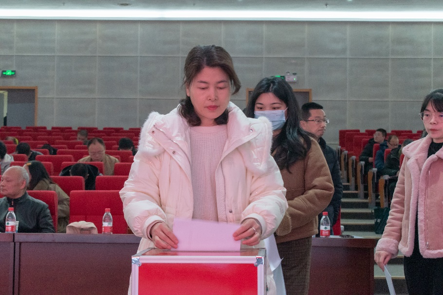 在民主测评环节中,本着公平、公正、公开的原则,工作人员现场展示了投票箱,而后教职工代表参与了民主测评投票。