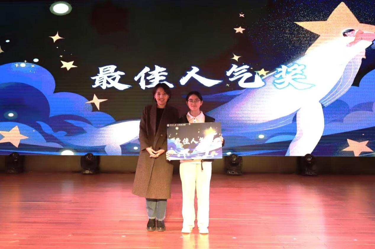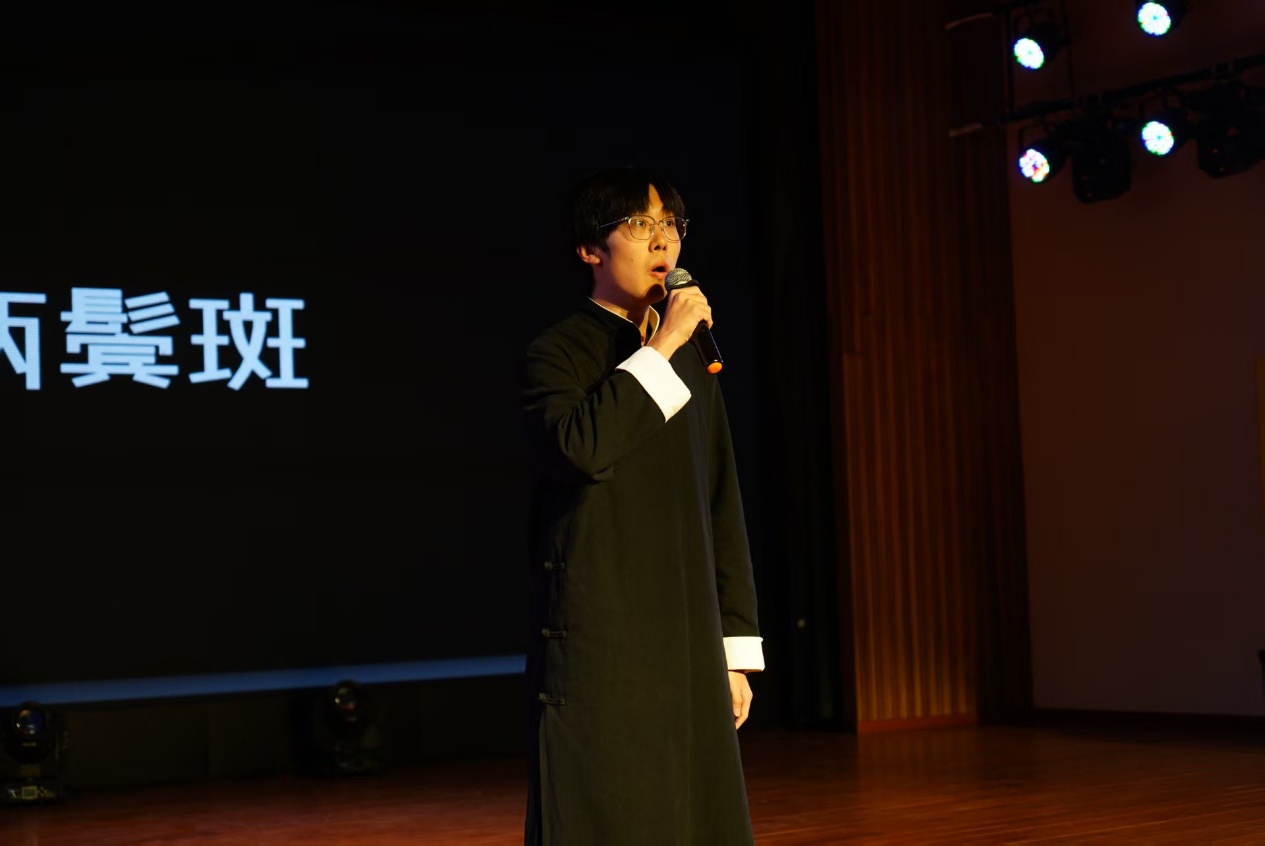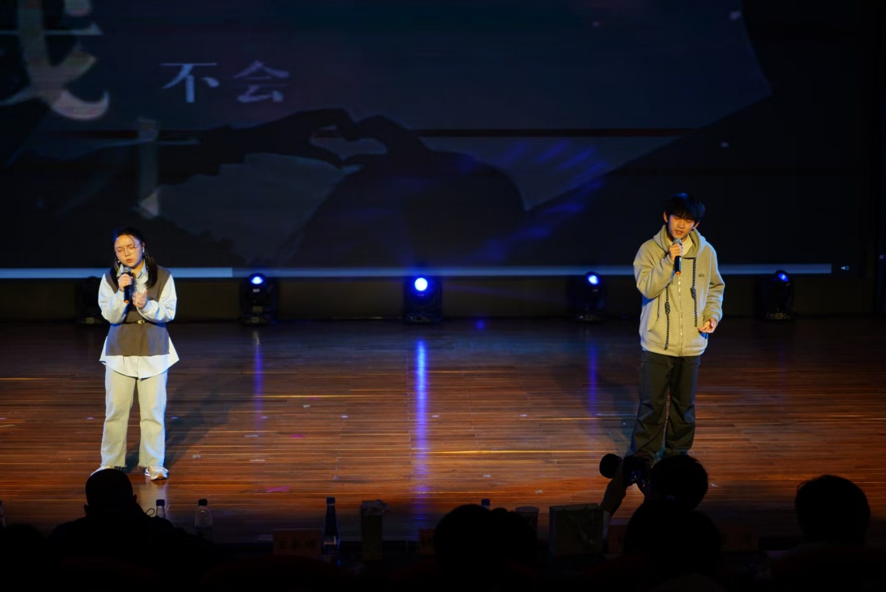 首轮互动环节的趣味猜歌游戏过后,节目节奏愈发多元:宁帅铭的京剧《鱼肠剑》字正腔圆,尽显国粹韵味;孔禹程的《大东北我的家乡》以质朴歌声勾勒故土烟火;姚姝畅团队的舞蹈《神的随波逐流》用轻盈舞步诠释活力,舒清瑶的《下潜》则以低沉声线叩击人心。第二轮互动环节的猜动画人物挑战,让师生在欢笑中拉近了距离。